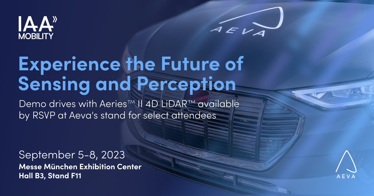 MOUNTAIN VIEW, Calif., Aug. 28, 2023 – Aeva® (NYSE: AEVA), a leader in next-generation sensing and perception systems, today announced it will demonstrate its high performance 4D LiDAR™ technology for the automotive industry at IAA Mobility 2023 in Munich, the world’s leading platform for the future of mobility, sustainability and technology.
